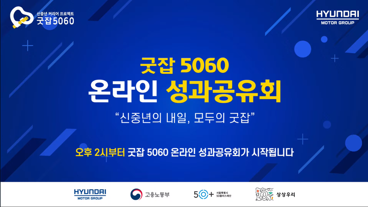 2020년 11월 17일. <굿잡5060> 온라인 성과공유회가 청담동 엠사운드 드림시어터에서 있었습니다. 굿잡5060은 현대자동차그룹, 서울시50플러스재단, 고용노동부, (주)상상우리가 협업하여 올해로 3년째 진행 중인 신중년 일자리 프로젝트인데요.