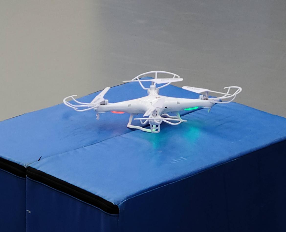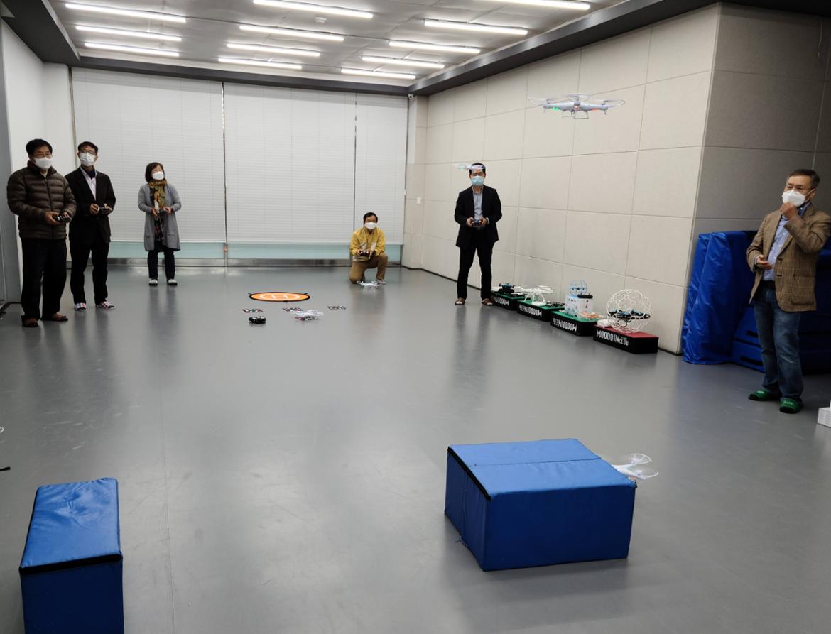 잠시 후 눈앞에서 드론이 이리저리 날아다니기 시작했습니다. 천장을 향해 오르는가 했더니 다시 옆으로 움직이고 회전도 하는 신기한 일이 일어났어요. 간혹 교통정리가 안 되어 부딪히기도 했지만 파란 구조물 위에 착륙시킬 만큼 안정적인 조종을 하는 분도 있었습니다.