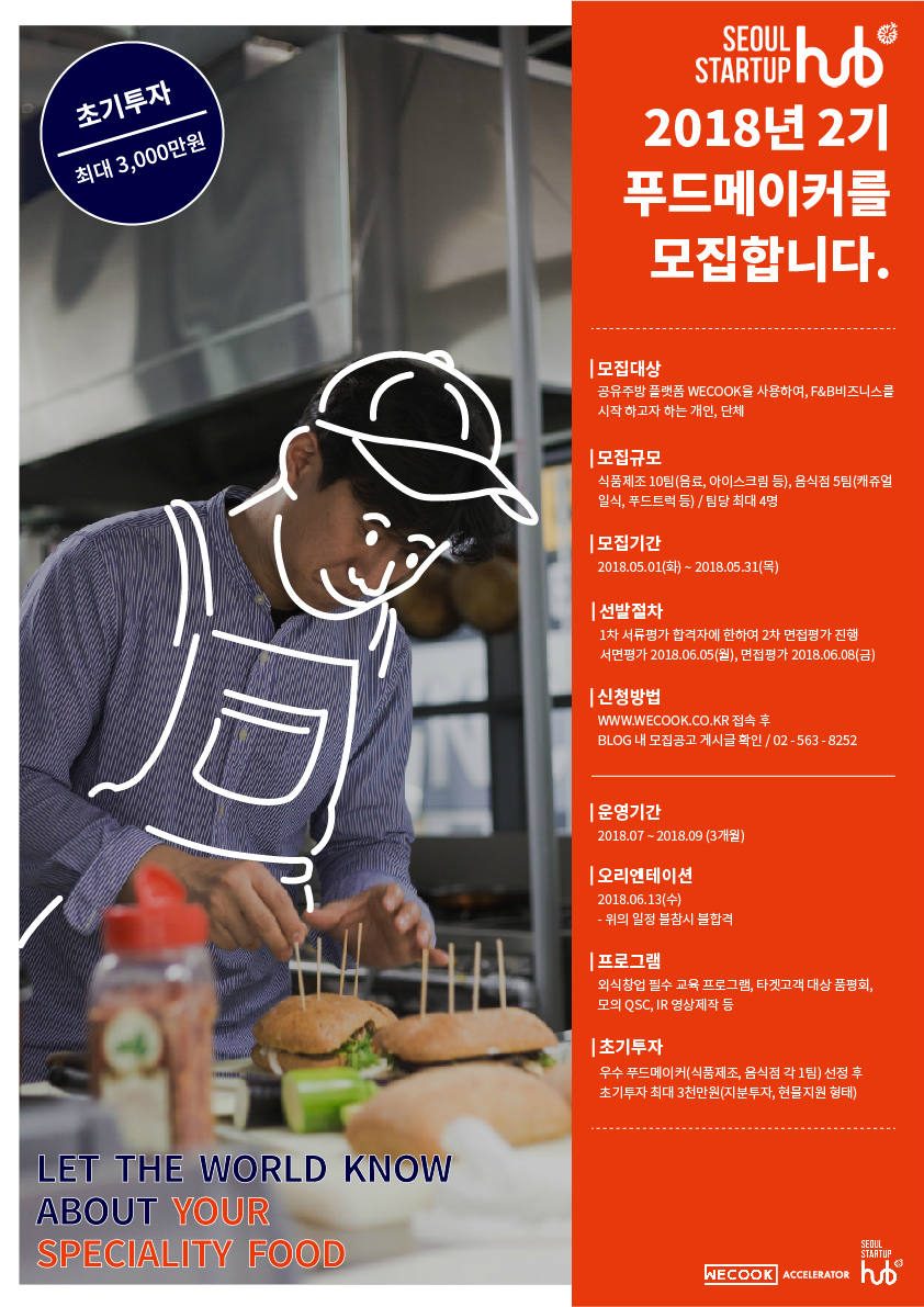 서울창업허브의 공유주방 플랫폼 위쿡에서 5월 31일(목)까지 키친인큐베이팅 푸드메이커 2기를 모집합니다. 위쿡은 외식 창업에 필요한 주방과 설비를 공유하고 실제 창업을 지원하는 플랫폼입니다.