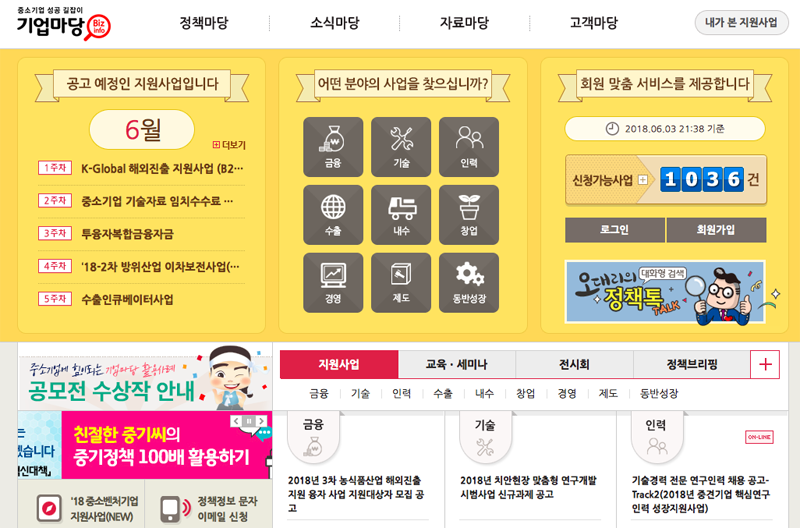 창업 관련 정보도 소개하고 있습니다. 창업을 비롯해 금융, 기술, 인력, 수출, 내수, 경영, 제도 등 영역별로 원하는 정보를 쉽게 찾아볼 수 있습니다.