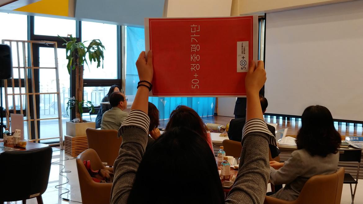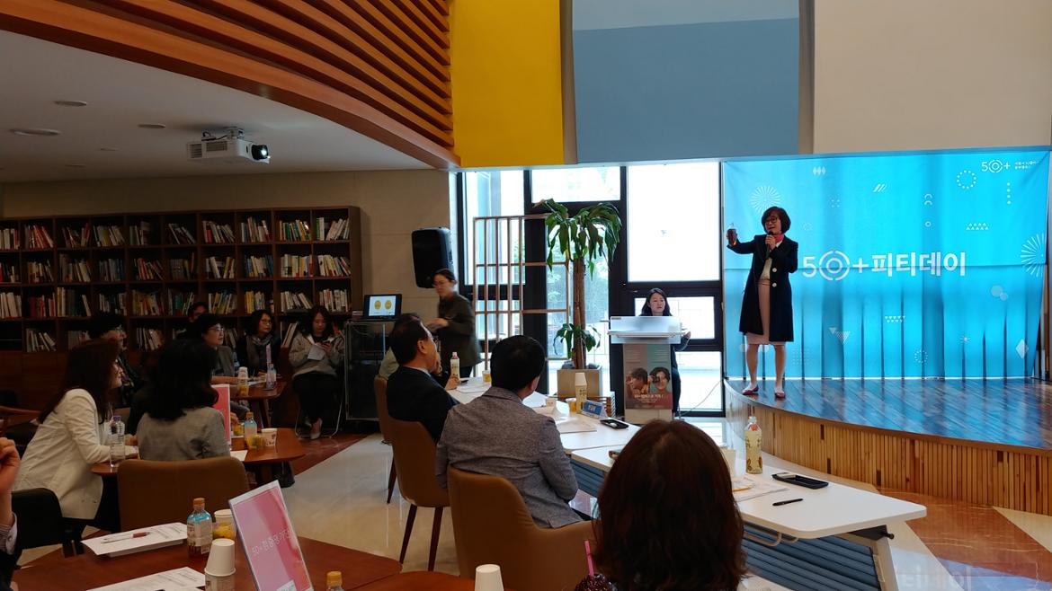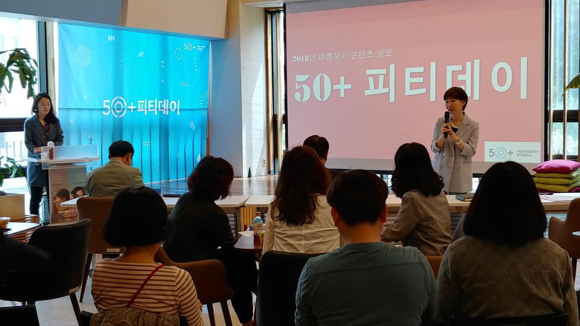 지난 5월 11일(금) 오후 2시! 50+ 중부캠퍼스의 '모두의 서재' 로비가 웅성인다. '2018년 상반기 피티데이' 때문이다. 피티데이 발표로 모인 30여 명의 신청자들이 조금은 긴장된 얼굴로 모여 앉아있다. 참가자들은 7분 동안 강의 주제와 내용, 진행방법, 자기만의 특색 등을 발표하는데, 이를 전문가와 청중 평가단이 종합 평가해 15명 참가자 중에서 10명을 최종 선발하게 된다. 청중평가단은 공정성을 위해 사전에 공고하여 모집된 이들로 구성되었다.