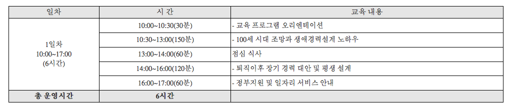 백세 시대 조망과 생애경력설계 노하우, 퇴직 이후 장기 경력 대안 및 평생 설계, 정부지원 및 일자리 서비스 안내 등의 주제로 교육을 진행합니다.
