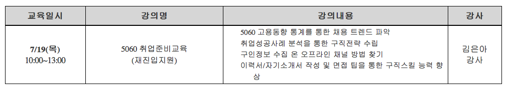 서울일자리센터는 7월 19일(목) 만50세~만64세 취업희망자를 대상으로 무료 취업 준비교육(재진입 지원)을 시행합니다.