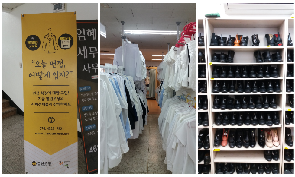 ‘열린 옷장’은 정장을 공유하는 비영리단체로 면접에 정장이 필요한 취업 준비생과 특성화고 청소년, 재활노숙인 등에게 저렴한 가격으로 옷과 소품들을 대여해준다.