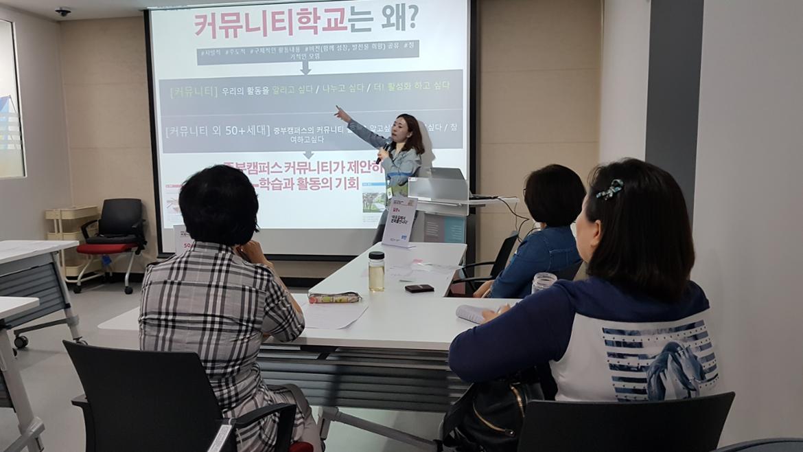 서울시50플러스재단 중부캠퍼스 문혜란PM은 "50+커뮤니티학교가 생소하다구요? 처음 개설되는 학교라 그럴 겁니다. 이는 서울시50플러스재단 중부캠퍼스의 '커뮤니티 플러스'가 주축이 되어 개설하는 강좌의 호칭입니다."라며 첫 발을 내딛는 커뮤니티학교를 소개했다. 참고로 '커뮤니티 플러스'는 50+세대 5인 이상이 모여 일·학습·문화·사회공헌 등의 영역에서 의미있는 활동을 하는 모임을 말한다.