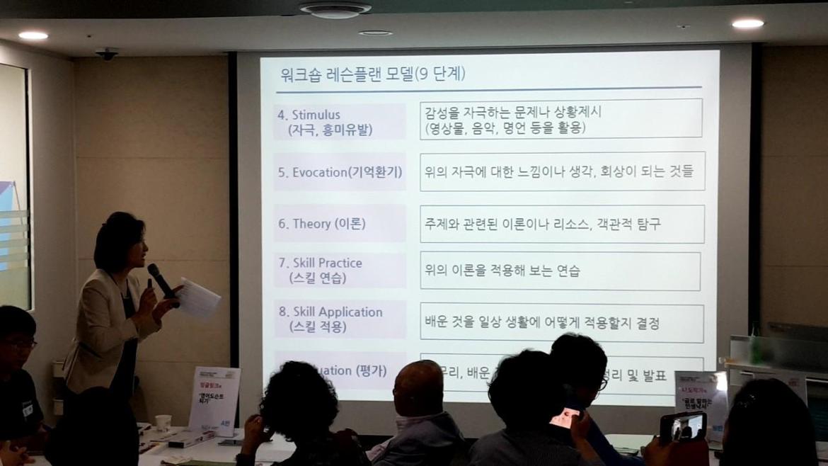 지난 6월 5일에는 커뮤니티학교 개설을 위한 준비회의가 있었다. 처음 여는 커뮤니티학교인 만큼 열기가 대단했다. 이진영 강사는 커뮤니티학교에서 강의할 강사들과 학습지원단, 커뮤니티 지원단을 대상으로 <퍼실리테이션 스킬로 나의 콘텐츠 효율적으로 전하기>를 주제로 강의했다. 이 강사는 커뮤니티학교의 강사들에게 1)강사가 아닌 퍼실리테이터가 돼라 2)역동적 참여를 유도하라 3)워크숍 플랜모델(9단계)을 활용하라 4)마무리 시간을 꼭 확보하라고 강조했다.