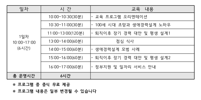 중장년 생애경력설계 프로그램은 퇴직 이후의 지속적인 구직 활동 지원을 위한 교육 프로그램으로 수료자에게는 일자리 상담 및 정보제공, 맞춤형 일자리 알선을 지원합니다.