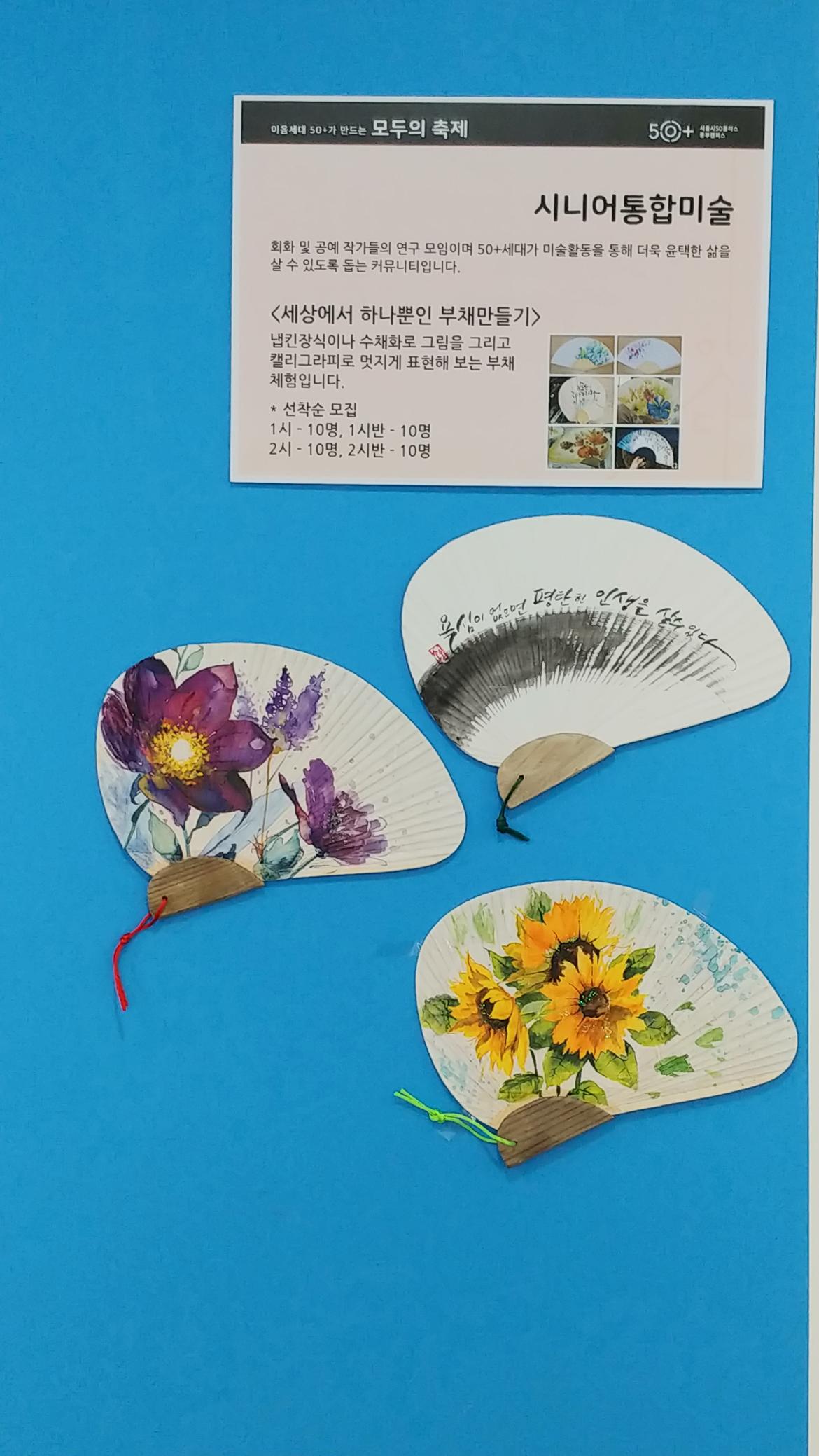 청춘목공의 '나무만년필 만들기'는 가장 많은 관심과 호응을 받은 체험장이다. 마을 공방 '사이'대표 이우경 이사장은 10주 과정으로 현재 3기 청춘목공 교육을 진행 중이다. 향나무 만년필에 사포질과 기름질을 하면서 그 시절 지난 이야기가 만발한다. 나무의 느낌처럼 기분 좋은 체험이다. 시니어통합미술연구소의 '여름부채 체험'은 길게 늘어 선 대기줄에서 미리 포기할 수밖에 없음에 아쉬웠다. 한 손에 완성품을 부치며 나오는 체험자들의 얼굴에 미소가 가득하다.