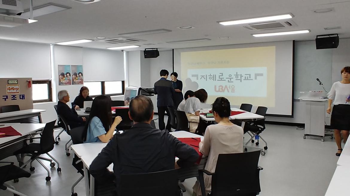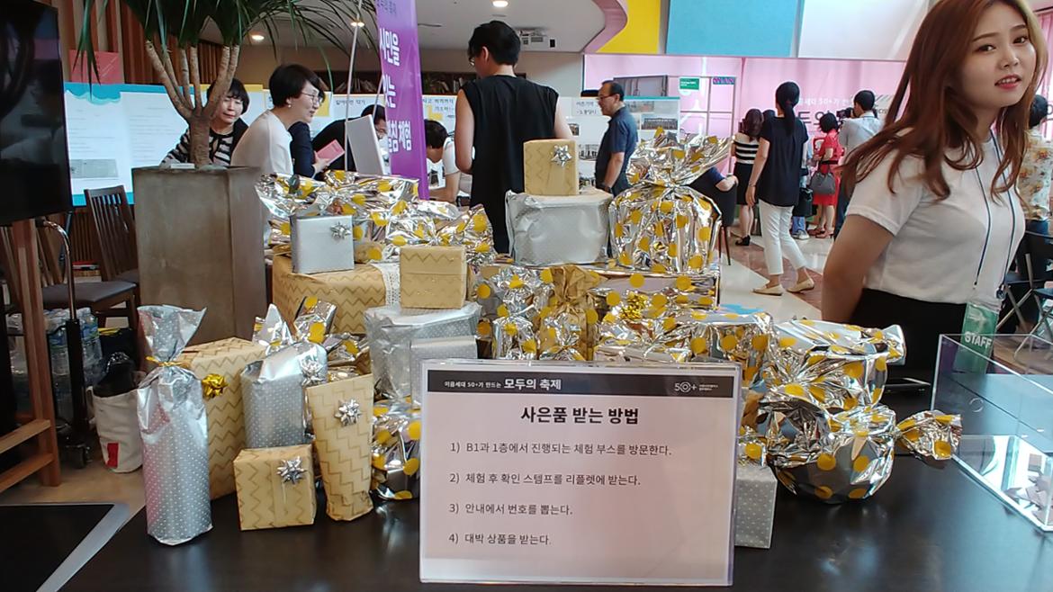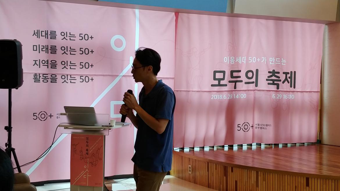 - 10시부터 중부캠퍼스 중앙 로비인 50+서재에서는 세대 간의 마음을 잇는 특강으로 진지하다. 꿈틀 박범준 편집장이 서울시50플러스재단과 삼성카드가 후원하는 '인생樂서' 캠페인에 대해서 이야기한다. 부모님과 대화하는 방법과 사진스캔 및 업로드 방법, 유용한 인터뷰 팁 등을 안내한다. 3달 안에 1,000명의 자서전을 제작하는 한계를 토로하면서 자발적 참여를 권한다. 부모님이하 친인척과 이웃 어르신 누구나 가능하단다. 그는 10월 DDP 출판기념회 안내까지 꼼꼼히 안내하며, 지하 몸짓교실에서 '자서전 미리 써보기'를 독려까지 하는 열정을 보였다.