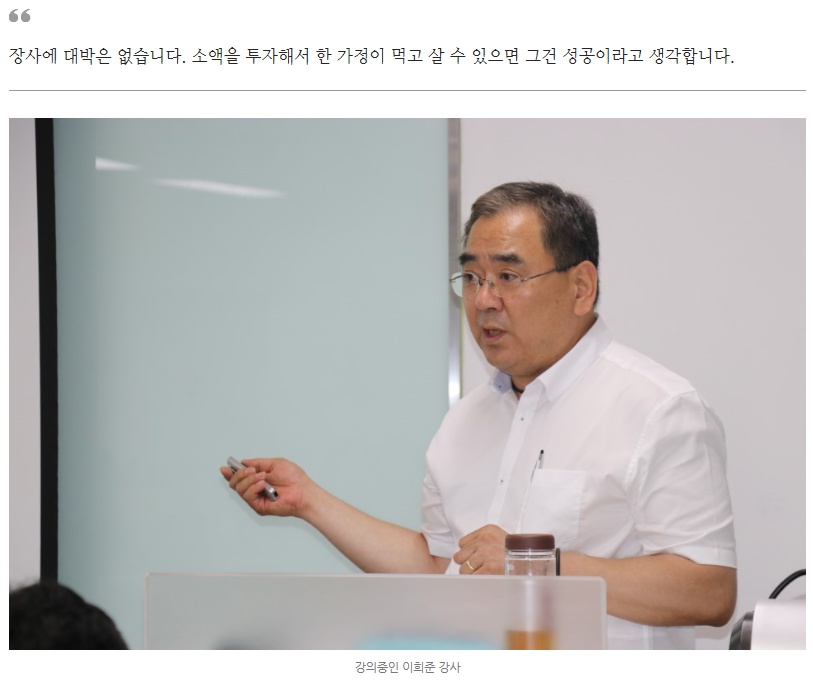 소액투자, 가족경영에 이어 성공을 위한 또 하나의 조건은 적극적인 영업활동과 소통이다. 이희준 강사는 동네 주민들과 적극적인 소통이 필요하다 말하며 ‘돈이라는 것은 사람을 버는 것’이라는 최인호의 ‘상도’에 나오는 구절에 감명받은 얘기도 들려줬다.