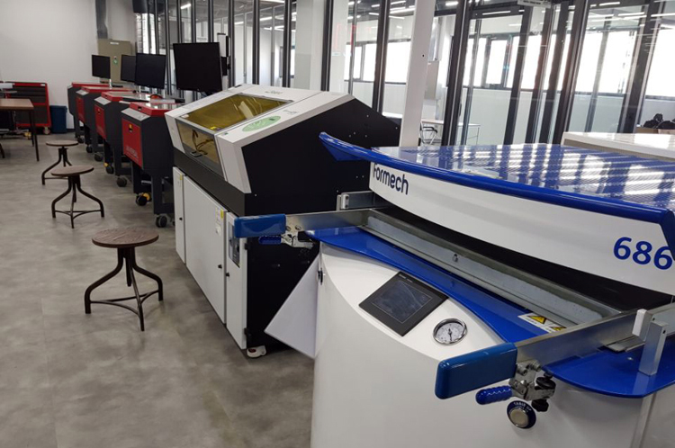 레이저커팅기, UV평판프린터, 진공성형기를 갖춘 디지털대장간의 디지털장비룸(출처: www.digital-blacksmithshop.com)