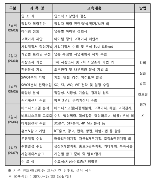 40시간의 이론 및 실습 교육이 9월 3일(월)~9월 7일(금)에 진행되며, 창업 아이템 고도화·비즈니스 모델 분석·멘토링 등으로 교육생이 사업계획을 수립하도록 돕습니다.