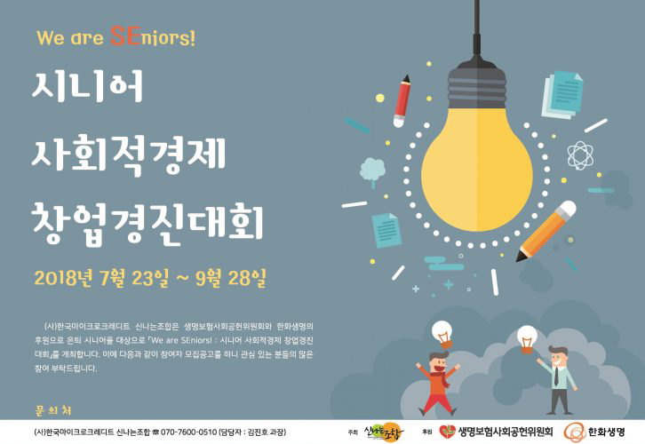 (사)신나는조합은 시니어 고용 안정에 기여할 우수한 사업모델과 성공사례를 발굴하기 위해 2018년 시니어 사회적경제 창업경진대회를 개최합니다.