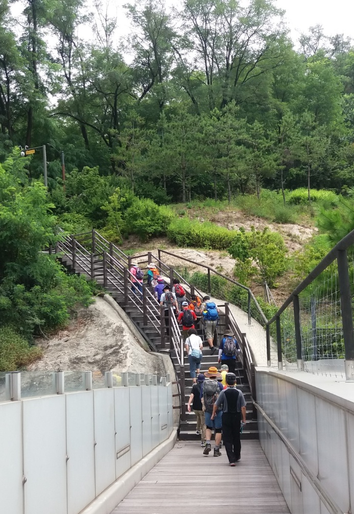 등산에서 가장 힘든 코스는 침대에서 현관까지라던데…… 만나기로 한 홍제역에 내리니 벌써 배낭을 메고 등산 스틱을 든 수강생들이 웅성웅성하고 있었다. 내 걱정이 기우 였구만. 다들 이렇게 아무렇지 않게 모이시다니…… 20여명의 인원이 차례로 계단을 올라 백련산을 향했다.