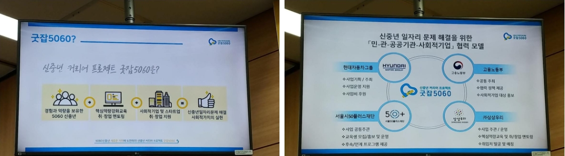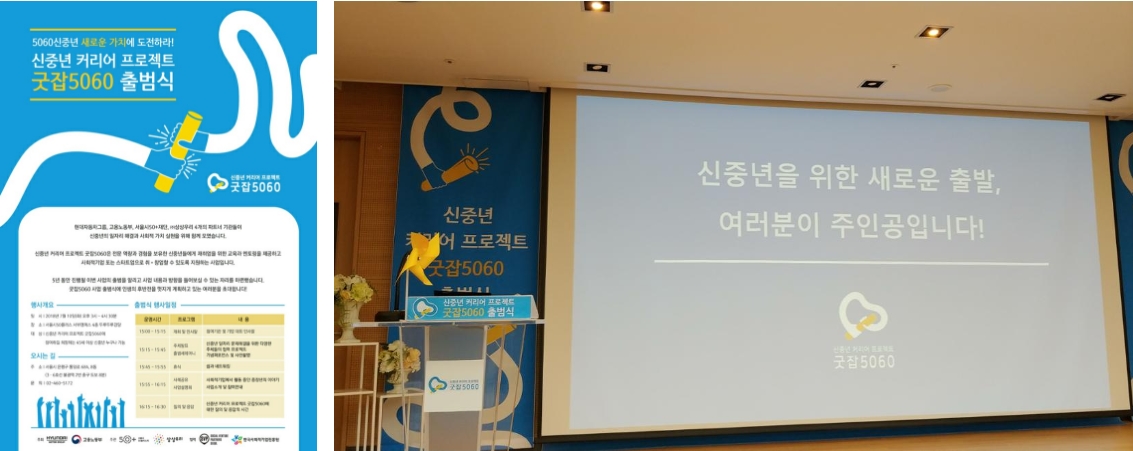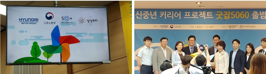 지난 7월 10일, '굿잡5060 - 신중년 커리어 프로젝트 출범식'이 서울시50플러스 서부캠퍼스 4층 강당에서 열렸다. 이번 행사는 고용노동부(정부), 현대자동차그룹(기업), 상상우리(사회적기업), 서울시50플러스재단(공공기관) 등 4개의 기관이 협력하는 프로젝트이다. 고용노동부는 공동기획과 협력정책 제공, 사회적 기업대상 홍보로 인생 3모작 기반 구축을 담당하고, 현대자동차그룹은 프로젝트 총괄기획, 사업운영지원, 사업비를 후원한다. 서울시50플러스재단은 교육생 선발워크숍 운영, 후속 연계프로그램 제공으로 신중년 세대와 기업참여를 유도 할 계획이다. 사회적기업인 상상우리는 신중년 세대의 유의미한 이전 경력과 경험을 포함한 핵심역량강화교육, 취업과 창업 멘토링, 후속교육 및 사후관리를 담당할 예정이다.
