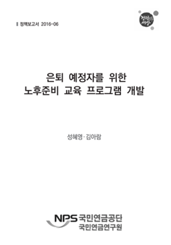 - 이 연구는 은퇴 예정자, 그중에서도 급여 생활자를 대상으로 재무, 건강, 여가, 대인관계 영역의 노후준비 교육 프로그램을 개발하기 위한 목적에서 시행함.