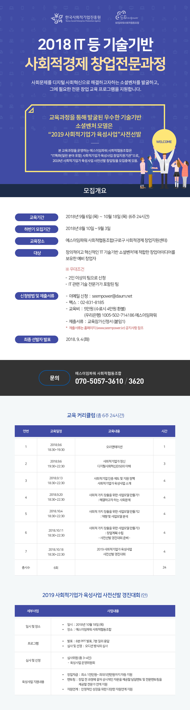 한국사회적기업진흥원과 SE임파워사회적협동조합은 9월 3일(월)까지 '2018 IT 등 기술기반 사회적경제 창업전문과정' 수강생을 모집합니다.