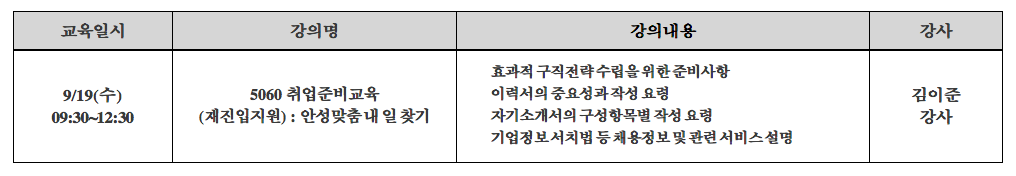 서울일자리센터는 9월 19일(수), 만 50~64세 취업 희망자를 대상으로 무료 취업 준비교육(재진입 지원)을 시행합니다.