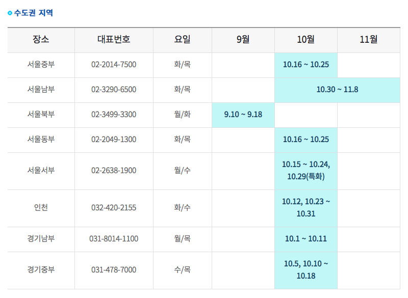 서울에서는 권역별(서부, 동부, 북부, 중부, 남부)로 5개소에서 교육을 진행하며, 각기 교육 일정이 다릅니다(아래 표 참조).