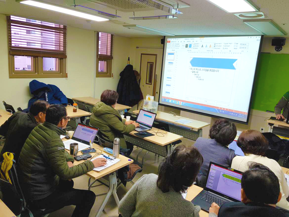 각자 노트북을 지참하여 파워포인트 슬라이드 작성(글쓰기, 도형그리기 등)과 다양한 효과를 적용해보았습니다.