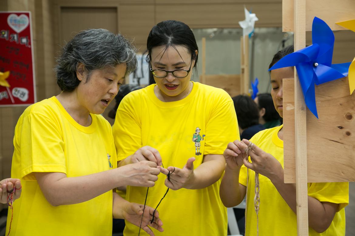 참 좋아보였다. ^^ 또 4층 로비의 세대 간 소통 콘텐츠를 개발하는 '재미+'가 운영하는 한지로 만드는 제기 체험부스도 인기가 높았다. '나와 우리를 찾아가는 책읽기'를 뜻하는 '나우책'은 인권과 관련한 내용의 문구를 넣어, 부채와 책갈피를 만드는 체험행사를 진행했다.