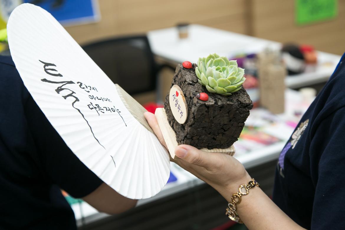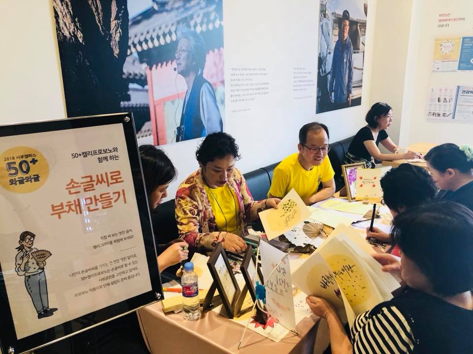 모두의 카페에 자리 잡은 '50+캘리 프로노보'는 캘리그라피가 적힌 세상에 하나뿐인 한지 부채를 선물해 주었는데, 종종 직원들도 함께 체험을 즐기는 모습이