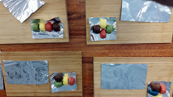 도마 위의 밀가루로 만든 네 가지 색 반죽 덩어리를 가지고 쿠키 만들기가 시작됐다.