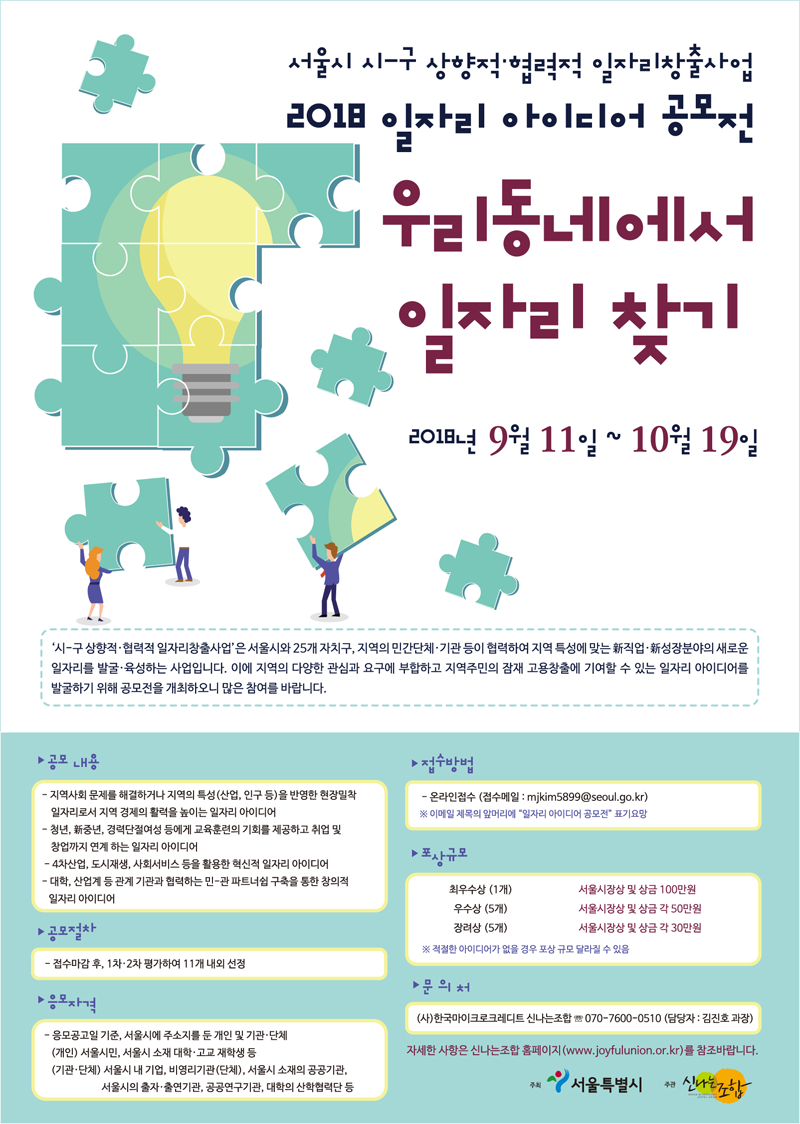 서울시가 주최하고, (사)신나는조합이 주관하는 2018년 서울시 일자리 아이디어 공모전 '우리동네에서 일자리 찾기'가 10월 19일(금)까지 진행됩니다.