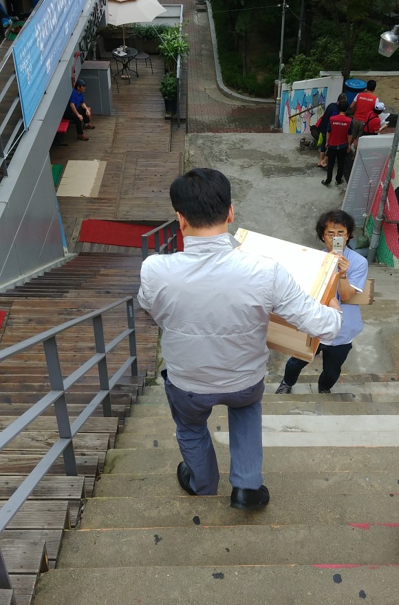 열심히 책상을 나르고 있다. 쪽방촌 지원단이 있는 사무실로 향하여