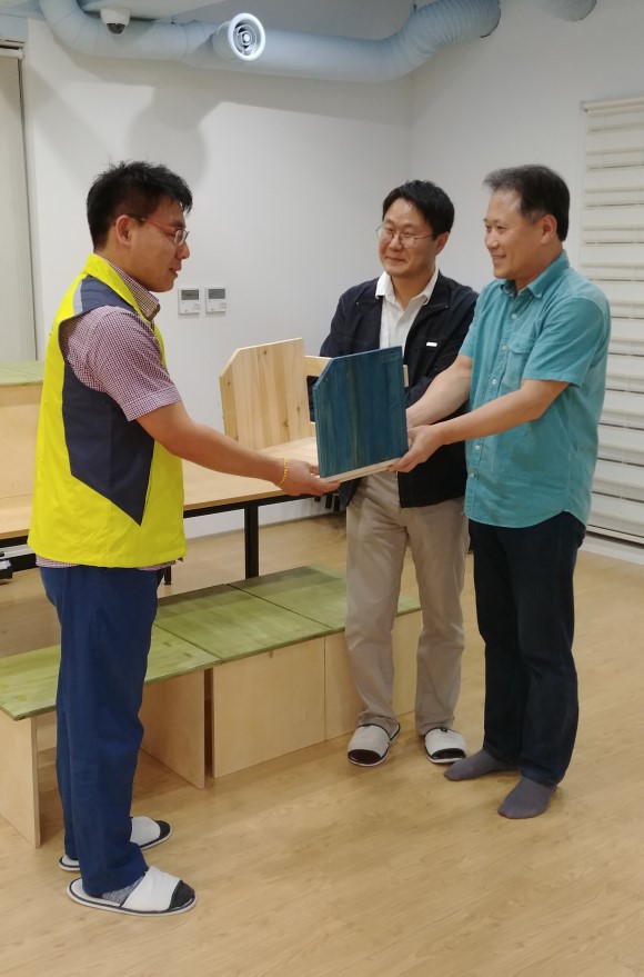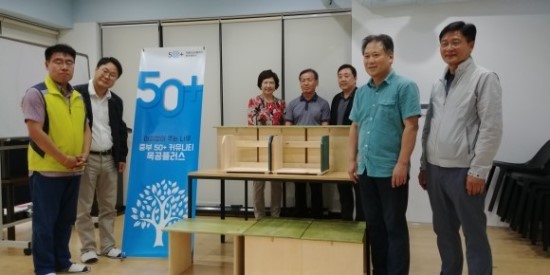 금년 4월에 50+중부캠퍼스에서 교육을 받고 8월말 경에 교육 수료후 회원들끼리 의기투합하여 목공품을 만들게 되었고 완성해서 전달하게 된 것이다. 1인당 2만 5천원 가량의 자비를 부담하여 재료를 구입한 후 테이블과 의자, 그리고 선반 등을 만들었다.