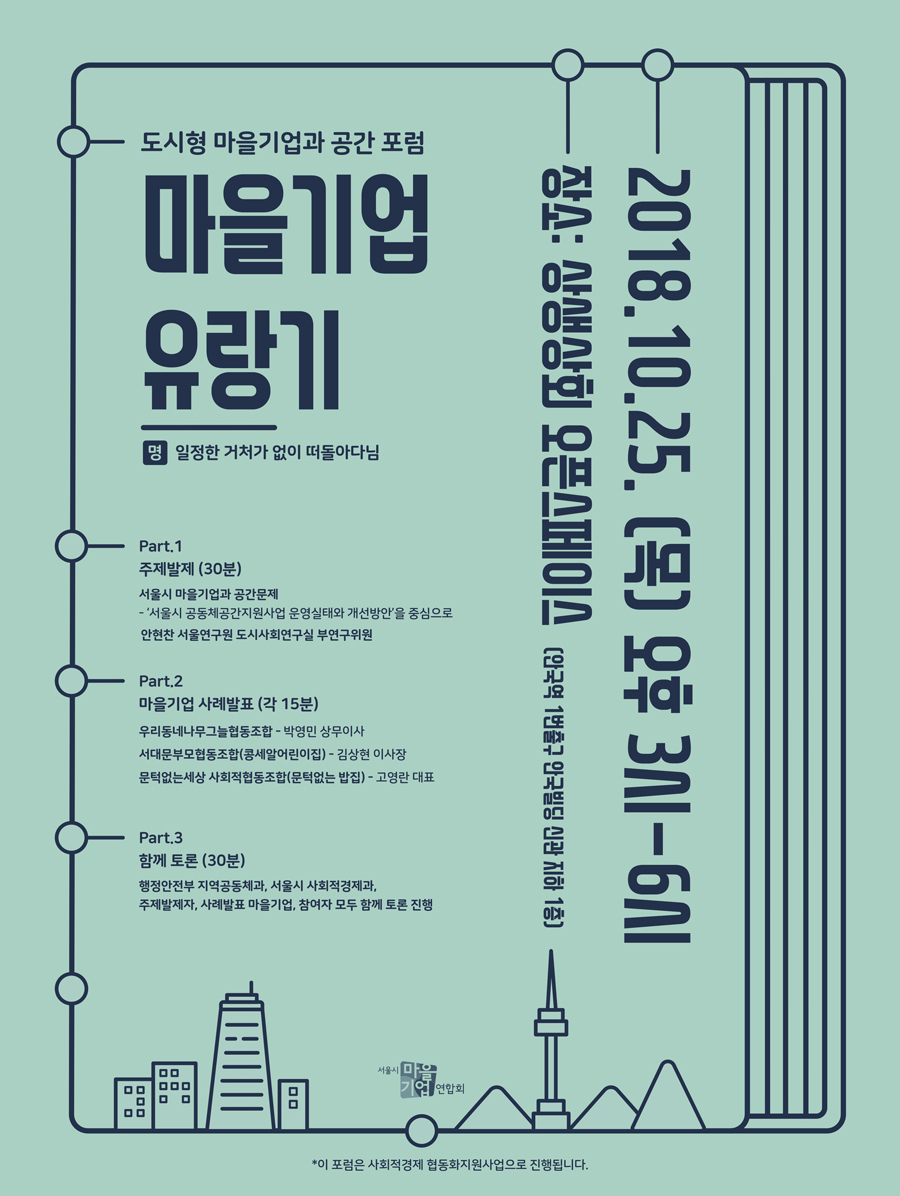 서울시마을기업연합회는 10월 25일(목) 15시~18시, 도시형 마을기업과 공간 포럼 '마을기업 유랑기'를 개최합니다.