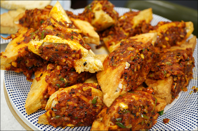 5. 튀긴 두부를 반으로 갈라 밥으로 채우고, 양념을 표면에 듬뿍 바른다.