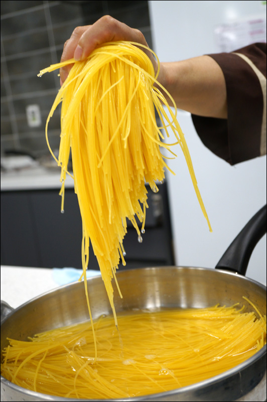 1. 시판 옥수수국수를 미지근한 물에 30분 정도 불린 후 끓는 물에 2분 정도 삶아 찬물에 헹군다.