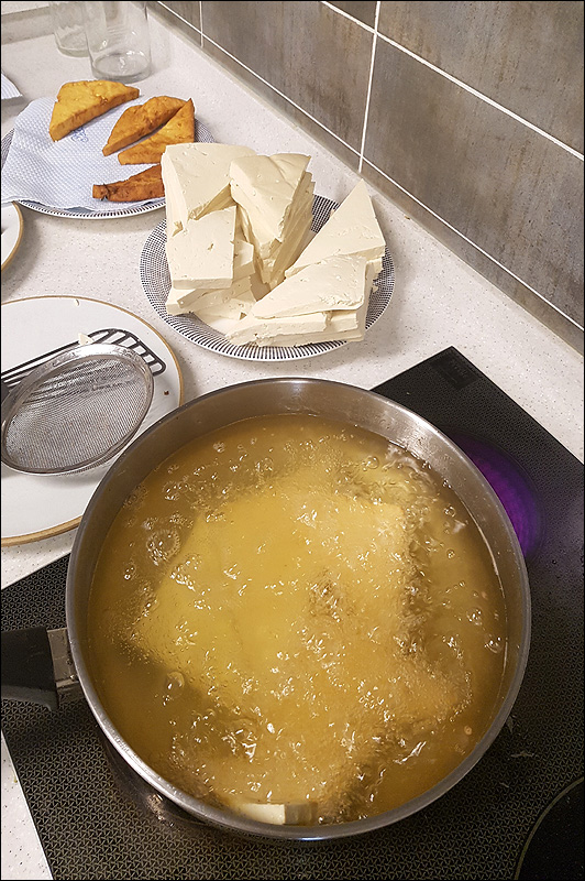 2. 물기를 뺀 두부는 적당한 크기로 잘라 기름에 튀긴다(혹은 지진다).