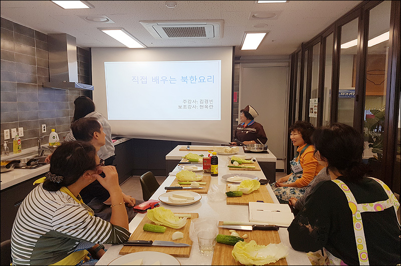 지난 1016일 중부캠퍼스 1모두의 부엌에서 있었던 직접 배우는 북한요리강좌는 그런 의미에서 시기적절하며, 그런 거창한 의미를 두지 않더라도 하나의 단품요리 강좌로서도 깔끔한 시간이었다. 요리를 지도한 강사는 함경북도 무산 출신으로 10여 년 전 남으로 이주하여 온 김경빈 씨였다. 이 날 김경빈 강사의 지도 아래 수강생들은 두부밥과 강냉이국수, 그리고 영채나물을 만들었다.