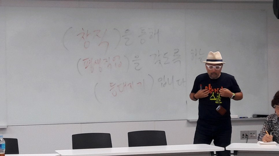 빨간색 뿅 망치를 앞에 둔 1인 기업[맥아더 스쿨] 정은상 교장이 코칭을 통해 토론과 실습 위주로 진행하는 <1인 창직 과정>의 두 번째 수업 시작의 첫 대목이다. 9월 13일부터 11월 22일까지 매주 수요일 10시-12시30분 9회 프로그램에서 1인 창직의 트랜드를 읽고 구체화시키는 생존법을 배울 수 있다. 의견을 나누는 과정으로 일명 거꾸로 교실, 플립 러닝 flip learning의 역 진행 수업방식이다.