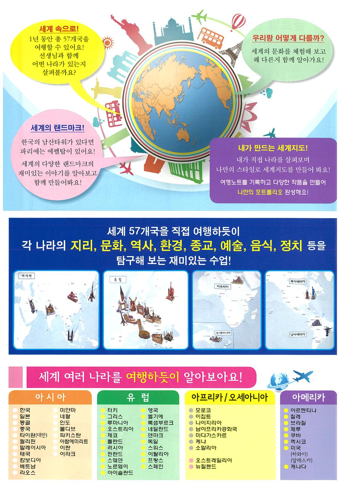 ◆교육내용 : 세계 57개국을 직접 여행하듯이 각 나라의 지리, 문화, 역사, 환경, 종교, 예술, 음식, 정치 등을 재미있게