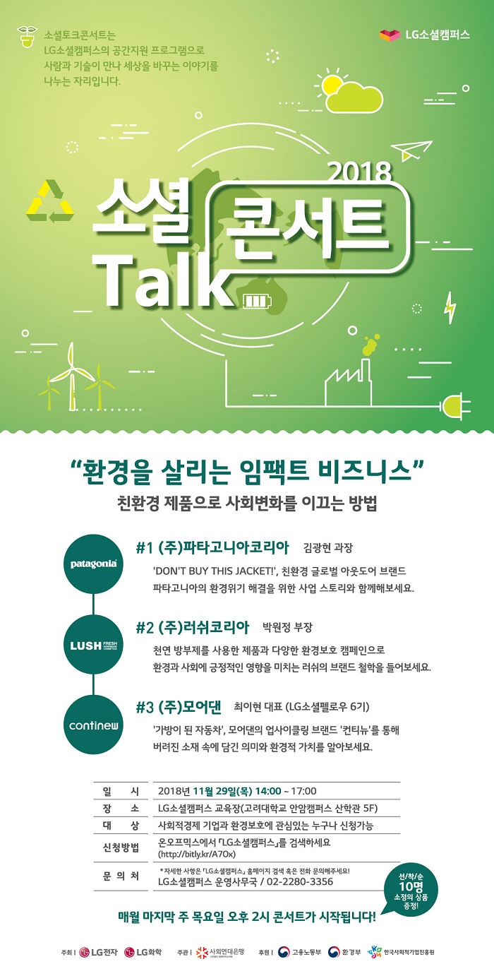 LG소셜캠퍼스는 11월 29일(목) 14시 안암동 고려대학교에서 '환경을 살리는 임팩트 비즈니스'를 주제로 소셜토크콘서트를 개최합니다.