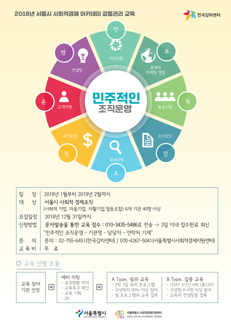 서울특별시 사회적경제지원센터와 한국감마센터는 12월 31일(월)까지 사회적경제 조직의 민주적 조직 운영을 위한 갈등관리 교육 참여 기관을 모집합니다.