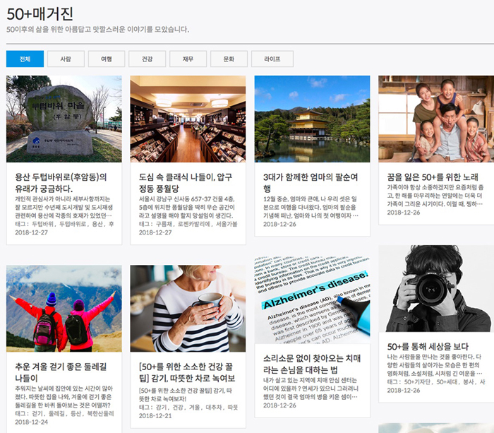 50+매거진소소한 팁이라는 두 개의 하위 카테고리가 있습니다. 소소한 팁은 50+세대에게 도움이 될 짤막한 생활 정보를 올리는 곳입니다. 글에서 살펴볼 곳은 50+매거진인데요. 50+매거진은 50+포털 전체를 통틀어 가장 활발하게 글이 올라오는 곳입니다. 2018년 한 해 동안 407편의 글이 업데이트되었으니, 하루에 한 편 이상이 업데이트가 된 셈이네요. '매거진'이라는 명칭이 암시하듯 50+세대가 관심 갖고 재미있게 읽을 만한 다양한 주제의 글이 모이는 곳입니다. 50+매거진이 다루는 주제는 사람, 여행, 건강, 재무, 문화, 라이프입니다.