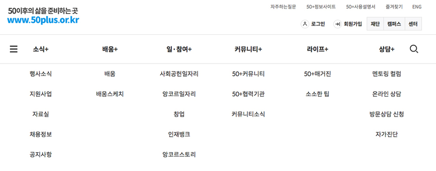 2018년 기획 아카이브 마지막 글의 주제는 50+포털입니다. 현재 50+포털에는 6개의 큰 카테고리(소식+, 배움+, 일·참여+, 커뮤니티+, 라이프+, 상담+) 아래 글이 게시되고 있습니다. 2019년 새롭게 업데이트를 시작하기에 앞서 2018년 한 해 동안 50+포털 각 카테고리에는 어떤 글이 올라왔는지, 카테고리별로 가장 많은 분이 읽은 글은 무엇인지, 단순 공지성 글을 제외한 기획 콘텐츠 중심으로 소개합니다.