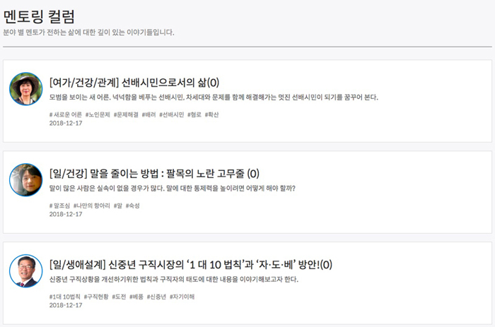 멘토링 컬럼에는 2018년 83편의 글이 업데이트되었습니다. 일, 건강, 생애설계, 재무, 여행, 재취업, 관계 등 분야별 전문 멘토 10여 명이 번갈아 가며 유용한 정보와 식견을 전했습니다. 아래 소개한 몇 편의 글만 봐도 어떤 성격의 콘텐츠가 올라오는지 알 수 있는데요. 재무나 건강 등 일상에서 바로 활용할 수 있는 주제와 관련된 실용 정보도 있는 한편, 좀 더 자신감과 활력을 갖고 삶을 대하도록 응원의 메시지를 전하는 글도 많았습니다.