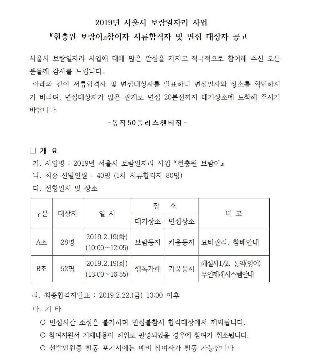 [동작]2019년 서울시보람일자리 '현충원 보람이' 서류전형 합격자 발표 및 면접전형 공지