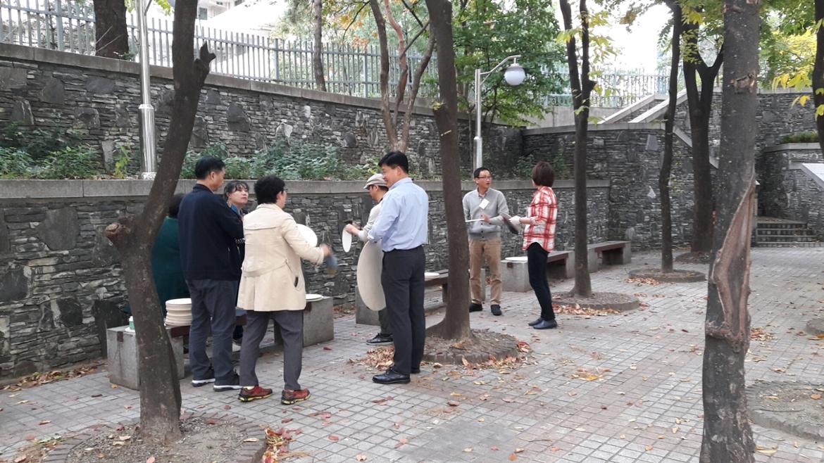 “예쁘죠?” “1차에서 오늘 나왔던 애기가 있었어요. 오늘 처음 참석하신 분들은 당황했을 것 같아요. 여러 가지 복잡한 행정 절차로 문제들이 바로 실행되는 것이 아닌 걸로 알고 왔어요. 꾸미는 이거는 참 좋은 거 같아요.” “나 이렇게 했어요. 덧칠하니까 더 멋있어요.” “ 낄 때 걸리게 되니 나중에 꾸밀 생각하세요.” “한 커뮤니티가 두 개씩 칠하면 금방 칠할 수 있겠다.” 저마다 어색함이 풀어진 듯 표정들이 환해진다. 함께 사포질과 칠을 하는 작업의 의미가 느껴진다.