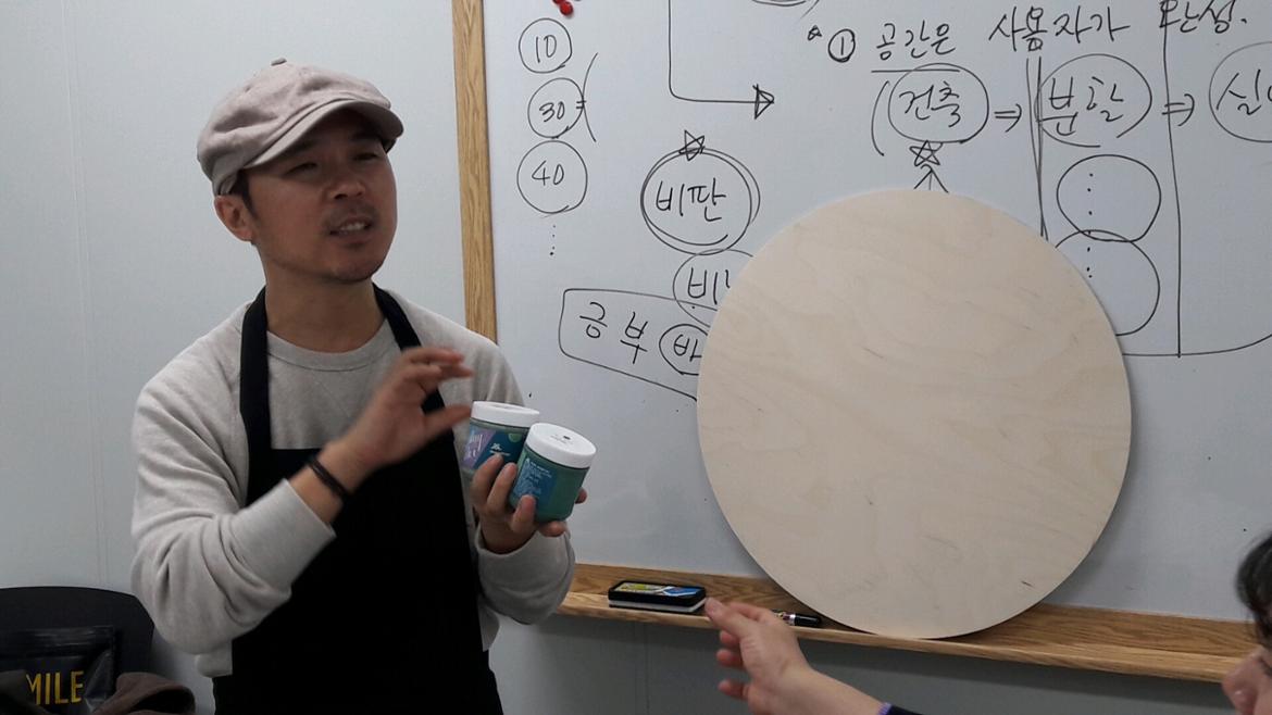 “가장 인간다움을 누렸던 세대가 50+세대다. 그 중 하나가 손으로 만드는 것이다. 손길에 따라 달라진다. 다름이 최고라고 생각한다. 75개 커뮤니티에서 한 분씩 나왔으면 좋았겠지만 하실 수 있는 만큼 해보시라.”는 이 디자이너는 벽면에 금속을 붙여 자기 위치를 바꿔갈 수 있는 자석 본드와 지우기 쉬운 워터초크를 이용해 준비한 100개의 원판 위를 직접 꾸며보길 권했다.