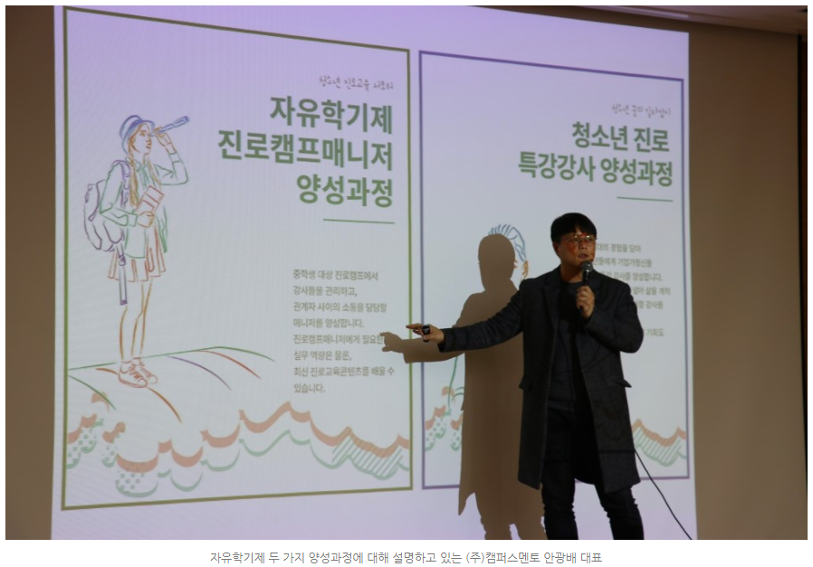 이번 개설된 ‘자유학기제 진로캠프 매니저 양성과정’과  ‘청소년 진로 특강 강사 양성과정’  두 교육과정의 내용 및 수료 이후의 활동에 대하여 소개하였다.