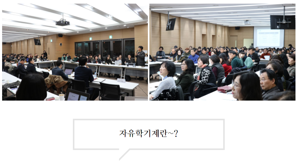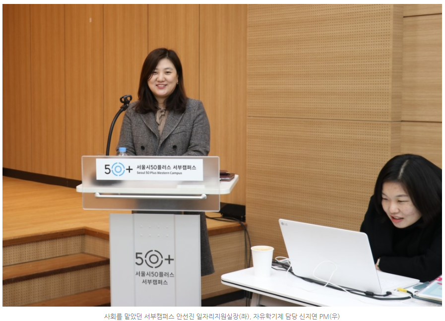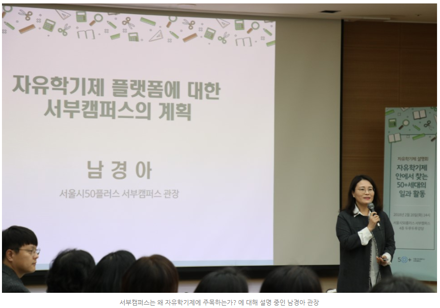 이 제도의 활성화를 위하여 서울시50플러스 서부캠퍼스는 지난 20일(화) 오후 2시 두루두루 강당에서 ‘자유학기제 안에서 찾는 50+세대의 일과 활동’을 주제로