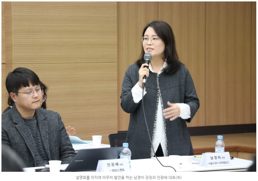 남경아 관장은 마무리 발언을 통하여 서울시50플러스 서부캠퍼스가 앞으로 50+세대의 경험과 역량을 활용할 다양한 혼합형 일자리를 발굴하는데
