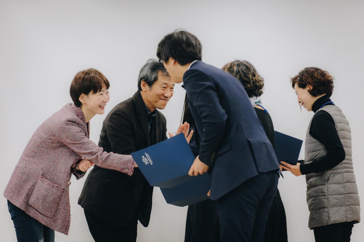 동기들의 스토리텔링에 귀 기울이며 지나간 시간을 회상하다보니 한 시간 반이 훌쩍 지나갔다. 이젠 수료증을 받을 시간이다. 수료증은 관장, 학장, 부학장이 함께 무대로 나와 각각 세 분에게 전달했다.