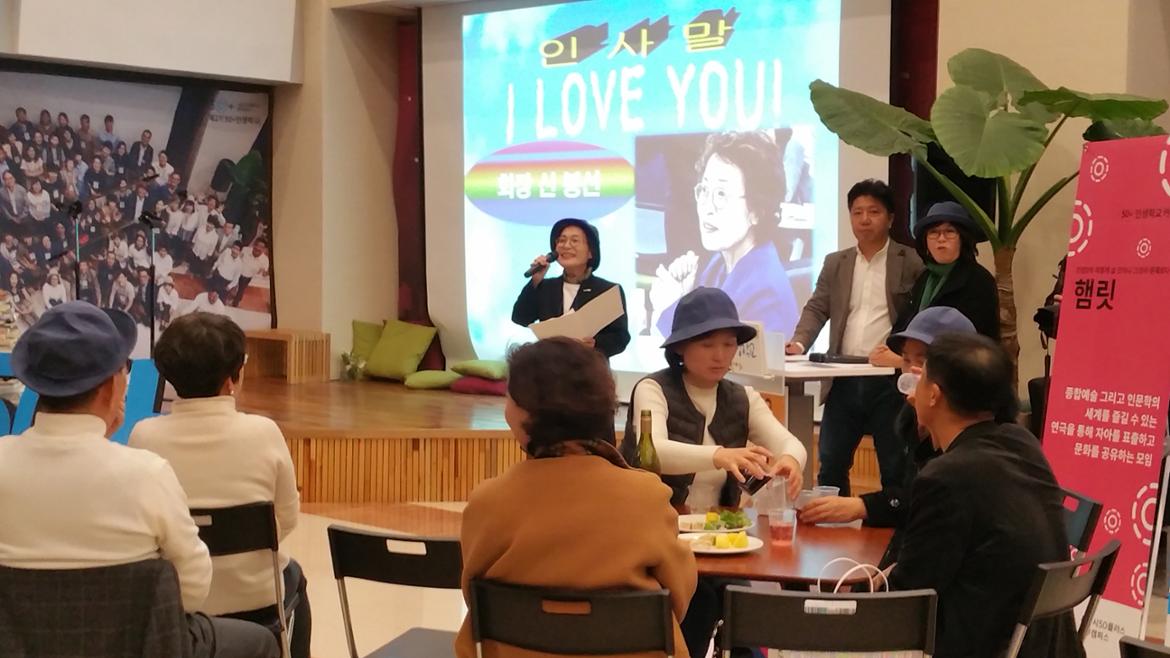 들뜬 분위기가 이어지면서 고선주 관장의 축사가 있었다. 고 관장은 졸업생의 스토리텔링에 대해 “맞아. 내 이야기야~ ”하면서 공감을 표시했다. 그리고 이곳 50+중부 캠퍼스가 세 번째 직장임을 밝히면서 “제가 인생학교에 크게 개입 하지는 않았지만, 훔쳐보는 재미를 선생님들이 쏠쏠하게 주신다.”며 이 자리를 빌어서 감사를 표시했다.